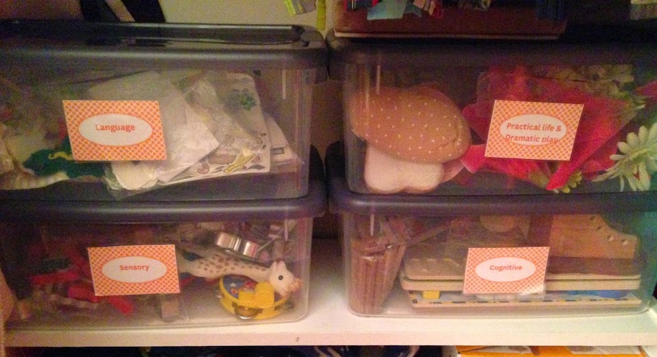 In the closet I keep bins divided by areas of development (cognitive and fine motor, sensory activities, language, and practical life/dramatic play.) I'm sure in the future I'll need bigger bins but this is all we have room for right now in our small apartment.